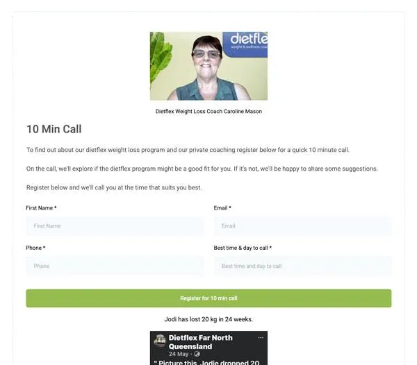 There is no need to create a website, so you save heaps on website development. We list you on our Dietflex page, and recommend you set up a free Google My Business page, so people can find you. Our most successful Dietflex coach does not have a website.