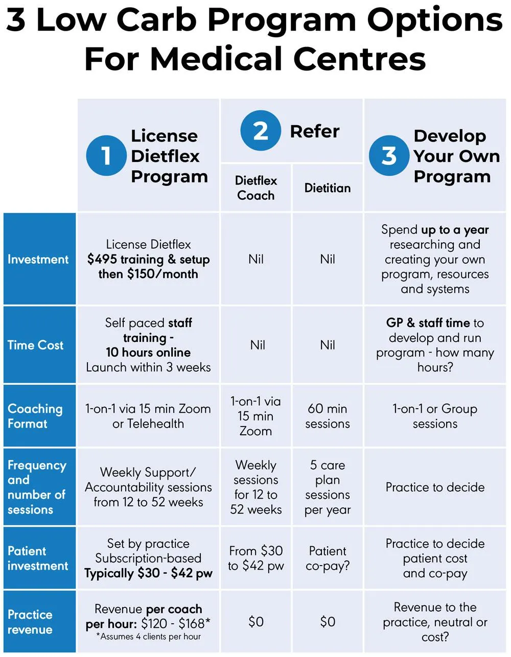 The Dietflex program creates a safe, structured pathway. It starts by giving the patient the Dietflex medical flier (LINK to sample) or referring them to a coach for a free call.